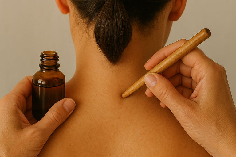 Eine sanfte Anwendung entlang der oberen Wirbelsäule und des Nackens, bei der leichte Impulse mit einem Holzgriffel sowie hochwertige ätherische Öle eingesetzt werden. Je nach Auswahl der Öle können unterschiedliche Bereiche unterstützt werden.