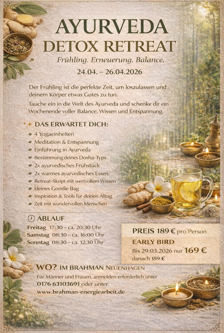 Wir laden dich herzlich zu einem Ayurveda Detox Wochenedne ein. Ein Wochenende voller Wissen, neuer Erfahrungen, Yoga, leckerem und vor allem gesunden Essen.